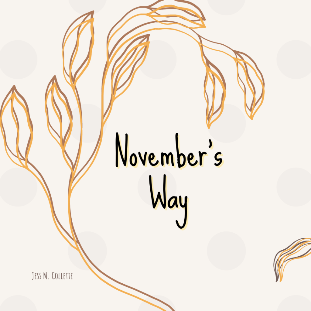 November’s Way November’s golden embers Grow dimmer by the day Faded and fallen Never long to stay Never ones to say goodbye Just gone for good one day Though we wish to hold on That is November’s way Share this: Click to share on Pinterest (Opens in new window) Pinterest Click to share on Facebook (Opens in new window) Facebook Click to share on X (Opens in new window) X Click to share on LinkedIn (Opens in new window) LinkedIn Click to share on Tumblr (Opens in new window) Tumblr Click to share on Reddit (Opens in new window) Reddit Click to share on Mastodon (Opens in new window) Mastodon Click to email a link to a friend (Opens in new window) Email Click to print (Opens in new window) Print Like Loading... Related